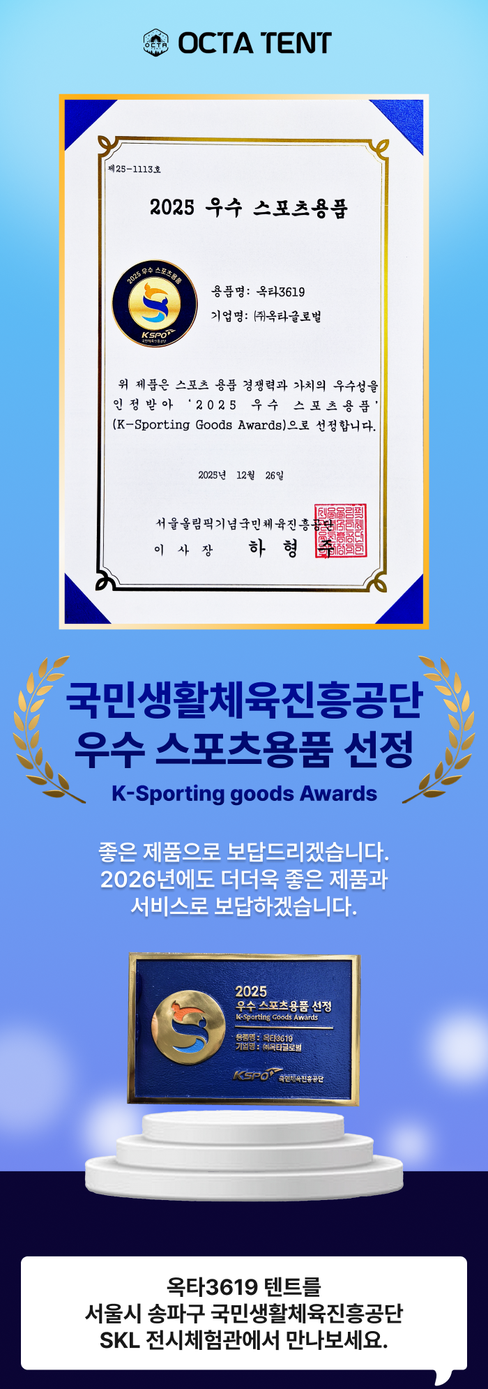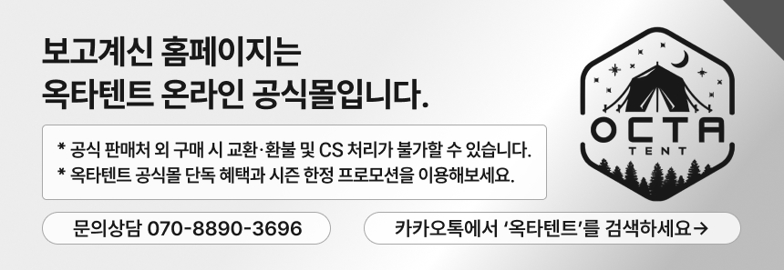 | 입구 타프 기능 (스탠딩 폴대 2pc 포함) 1분만에 설치 가능한 텐트에 출입구면 입구타프 형태로 연출이 가능합니다. | 길어진 옥타 로고 핸들 설치 시 짧았던 손잡이에 불편함이 있어, 손잡이를 더욱 길게 만들었습니다. 이제는 마음껏 당겨주세요. | 개선된 바닥 보강 육각쉘터의 특성상 바닥부분과 웨빙이 맞닿게 되면 끌림현상이 발생하여 바닥이 터지게 됩니다. 이를 방지하고자 고급 PVC로 바닥부분을 재보강하였습니다. |